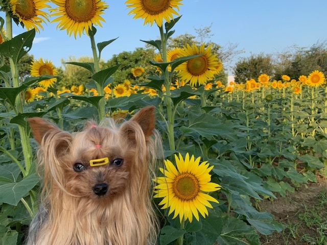 ひまわりおさんぽ ひまわりを見ながらおさんぽ♪お日さま浴びてキラキラ✨ラグビー場側でおさんぽをしてからひまわりをみにいったのだけれど びびたんおさんぽするーってテケテケ日向多いし暑いから少しねって言うのを聞かず30分くらい歩かされました😆びびがうれしそうだったからいっけど汗ビチョだょ🤣