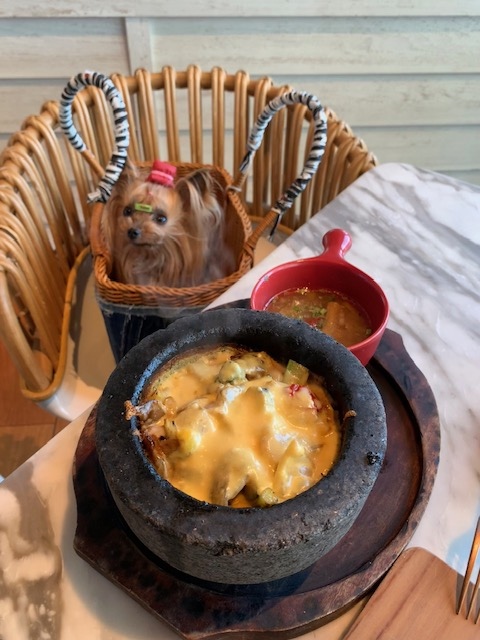 メキシカンチーズフォンデュ? 熱々の溶岩の器にエビとチョリソーとお野菜が入っていて店員さんが熱々とろーりのチーズソースをかけてくれます最後まで熱々😄トルティーヤに巻いてたべましたびびたんはきょぅも😴スースー寝ていましたョ😊
