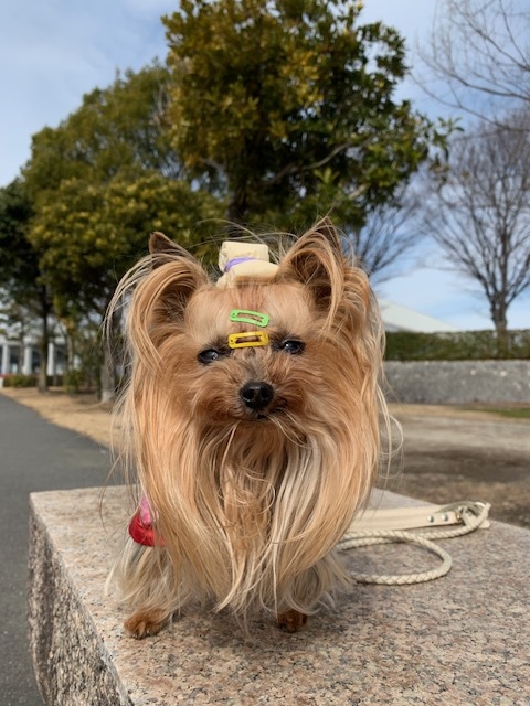 びびンポ いつもよりはやく公園へお部屋よりお外あたたかいですベンチをみつけるとすぐ休憩をしたがるびびたんダダがいっしょのときダダからもらえるおやつを覚えておやつ休憩をしたがるように😄歩くよりそれがたのしみなのかな?😆