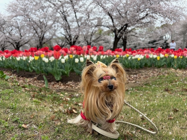 おしゃンポ チューリップきれいだねー桜とのコラボをたのしみながらおんぽしようとお隣町の公園へ混む前にってはやく行ったらびびたんには寒かった?歩きはじめて10分15分でブルブル震えちゃってお写真をあわてて撮って帰ってきました笑行くのに40分 おさんぽは10分、帰りもまた40分。行き帰りの時間より滞在時間がはるかに短っ!🤣シュナの♂とごあいさつをしてクンクンをたくさんして、くん活もたくさんして、たのしそうだったから😊よかったねー😄