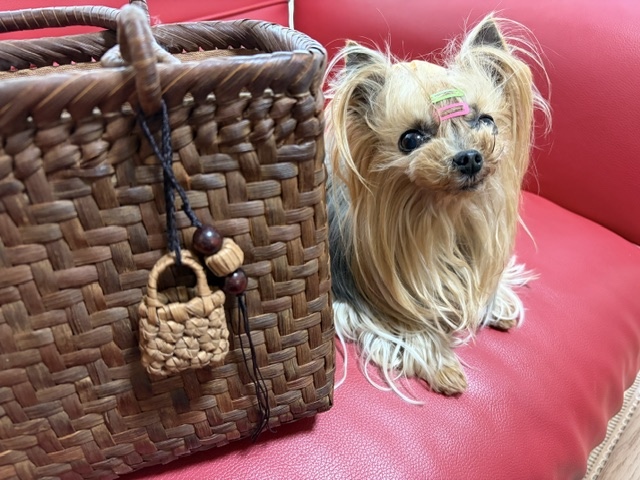かわいぃの? 山葡萄かごバッグミニミニサイズのチャームかわいくてかわいくて🥰一目惚れ😍お願いしてつくっていただきました、特別にありがとうございますたいせつに、艶々になるよう使いたいとおもいます😊びびたんがびびたんもーっていっしょに写ってくれましたププ